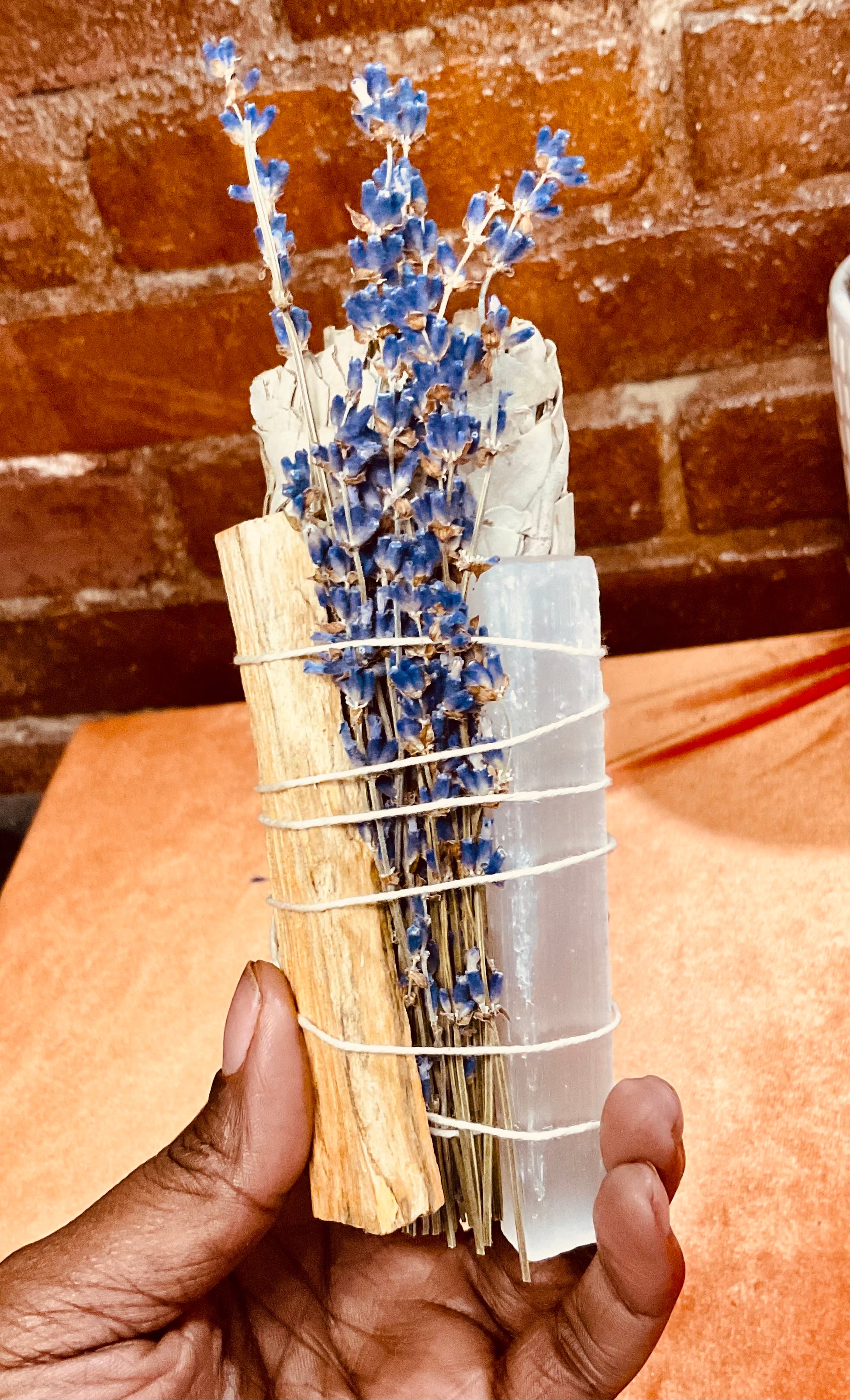 Completing the trio is a Palo Santo Stick, measuring 3-4 inches, which adds a delightful and soothing aroma to your clearing rituals. Palo Santo, meaning "holy wood," is traditionally used in spiritual practices to cleanse and purify spaces, as well as enhance meditation and relaxation.
