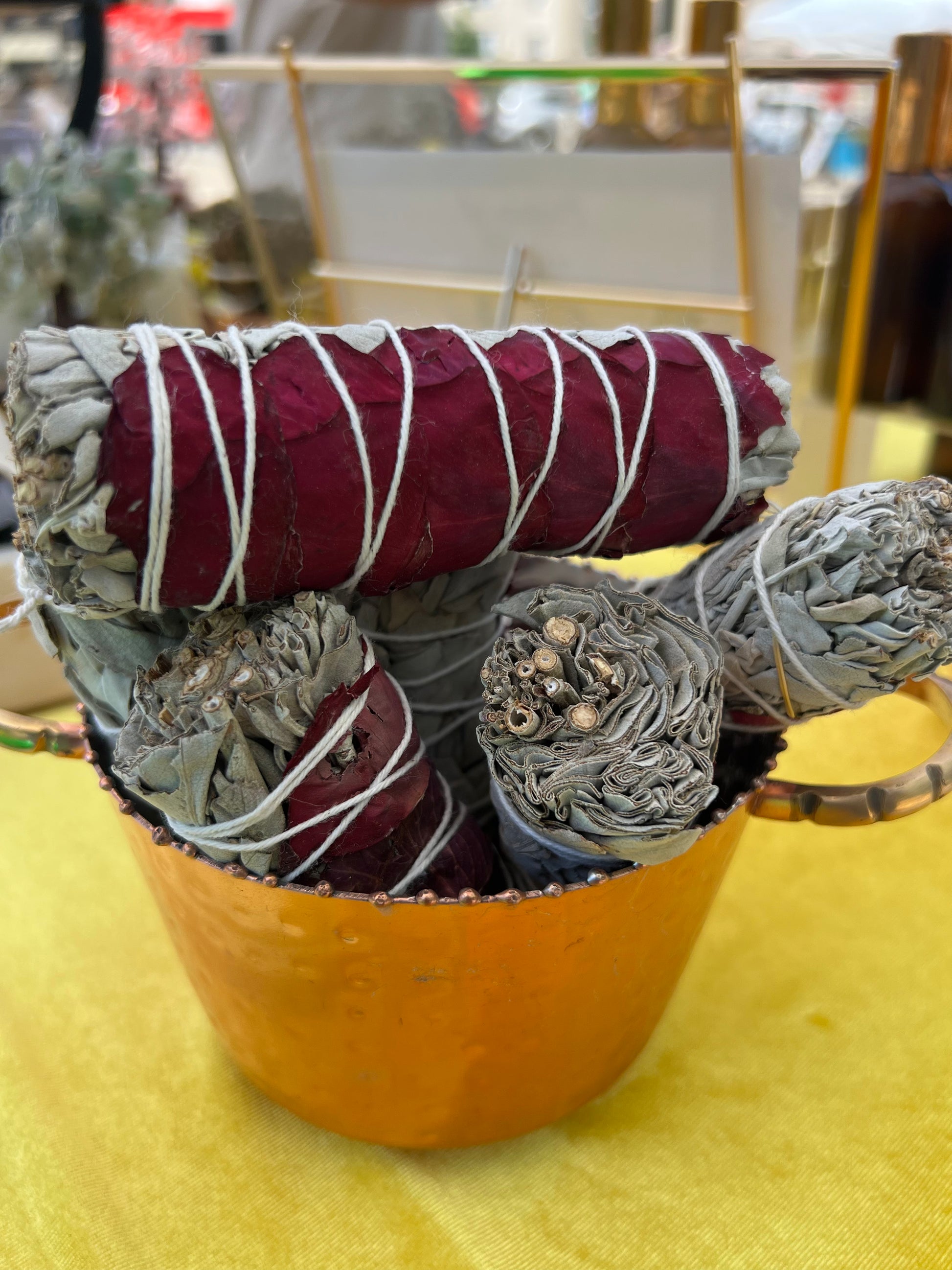 Sage is one of the most effective herbs to use for smudging, or clearing away negative energy. Roses have the highest vibration of all the flowers, making this a perfect way to connect to your inner divine